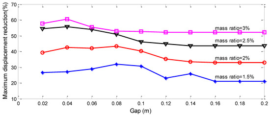 Gap is an important factor, because the SPPTMD relies on the collision between the mass block with the limiter to consume the kinetic energy of the tower. The vibration reduction ratio curves of the SPPTMD with different mass ratios and gaps are shown in Figure 14. As a result that the swing of the mass block decreases increasing mass ratio, to ensure that the mass block can collide with the viscoelastic material, there must be different optimal gaps at different mass ratios. The numerical results indicate that the optimal gap decreases from 8 cm to 4 cm when the mass ratio increases from 1.5% to 3%. Moreover, the optimal gap has a range for every case. In addition, if the gap is too large, no collision will occur. Take the case of a mass ratio of 2% as an example, the gap can be selected from 4 cm to 10 cm. When the gap is larger than 16 cm, the mass block does not collide with the viscoelastic material; in this case, the SPPTMD equates with the SP.