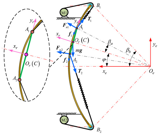 The studied twin-motor cable driven system is shown in Figure 1. It is composed of motors, an arc guide rail, flexible cable, pulleys and the moving platform. Affected by the unidirectional force property of the flexible cable, the moving platform can only reciprocate along the arc guide under the cooperative traction of the motors on both sides. This system is a typical redundant actuation system. To facilitate subsequent discussion, the fixed coordinate system E: () on the base frame and the reference coordinate system R: () on the moving platform are set, and their origins and are coincident with the arc center and the centroid of the moving platform, respectively.