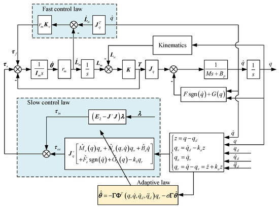 Since is much smaller than other parameters, the changing rate of tension in (15) far exceeds that of q in (11). On the time scale, the variables and q can be divided into two types: fast and slow. When the fast variable changes, the slow variable q can be considered frozen. Therefore, in (15), the transfer function from the torque to the cable tension can be approximated as a second-order system. At low frequencies, due to the filtering of the system itself, the high-frequency part of the system response is filtered, and the flexible system is equivalent to a rigid one. As the frequency increases, the system’s ability to filter high-frequency response decreases, and the impact of the flexible cable on the system gradually increases. When a certain frequency is reached, the impact of the flexible cable cannot be ignored, and even damage the system stability. To solve this problem, a composite adaptive control scheme based on singular perturbation is proposed.