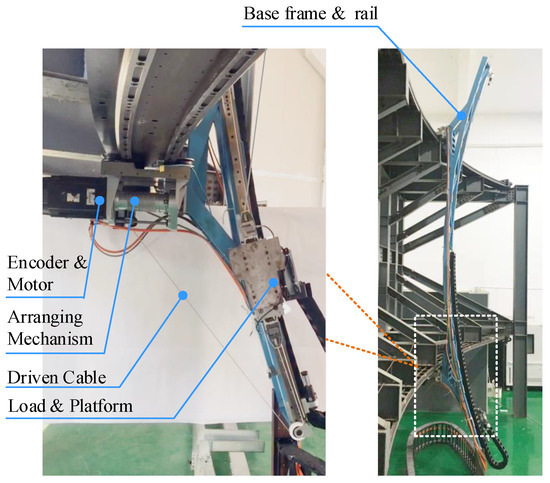 One research prototype of the twin-motor cable driven system is developed as shown in Figure 4. It is mainly composed of two parts: the transmission system and the control system. The transmission system includes motors, cables, an arranging mechanism, a guide rail and sensors. Cables are connected between the motors and the moving platform. To prevent cables from winding irregularly, the cable arrangement mechanism is also designed and installed on each motor, so that the cables can be arranged on the rotating shaft regularly.