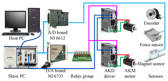 The measurement and control system is shown in Figure 5, the hardware includes the host and slave computers, A/D and D/A boards, drivers, motors and sensors. Based on the Labview software, the control program is designed with functions of command input, status detection, data processing and storage. All data in the slave computer will be processed within 1 ms. Therefore, the applicability of the control method should be considered.