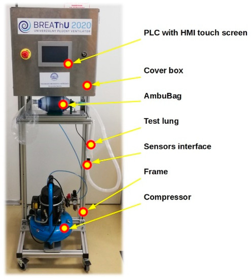 The mechanism of AmbuBag compression is based on a proportional pneumatic system. Many hospitals in our country (Slovakia) have compressed air supply (0.5 MPa) within their buildings. For this reason, this system works based on a pneumatic-based mechanism. The main parts of the ventilator BreaThU are frame, air compressor, AmbuBag, sensors, cover box and PLC (Programmable logic controller) with touch screen, see Figure 2. The frame consists of Bosch Rexroth aluminum profiles which are suitable for fast assembling of constructions. They are standardly used in industry as a part of production lines. An air compressor serves as the energy supply for the pneumatic system.
