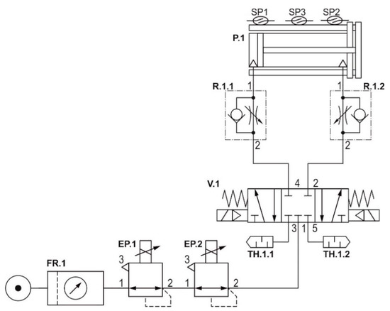 Individual points of the scheme represent the following components: FR.1—manual pressure regulator, EP.1—E/P regulator (pressure control), EP.2—E/P regulator (air flow control), TH.1.1 and TH.1.2—silencers, V.1—5/3 pneumatic valve, R.1.1 and R.1.2—throttle valve, P.1—double-acting pneumatic linear actuator, and SP1, SP2 and SP3—end sensors. All pipelines in the designed pneumatic system are made from polyurethane. Connection pipelines between individual pneumatic components are as follows: Pipeline between compressor and FR.1 has length 2.1 m with inner diameter 4 mm, pipeline between EP.1 and EP.2 has length 0.65 m with inner diameter 4 mm, pipeline between EP.2 and V.1 has length 0.38 m with inner diameter 4 mm and pipelines between V.1 and P.1 have length 0.42 m with inner diameter 2 mm.