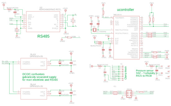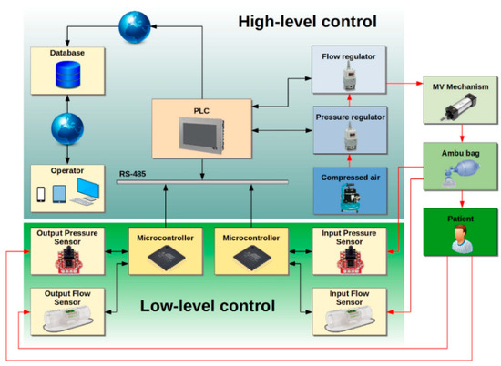 The control system of the mechanical ventilator BreaThU works on two levels. The first one is low-level and the second is high-level. The low-level control system is based on the microcontroller Atmel ATxmega16E5, which communicates with pressure and flow sensors [19]. The ventilator uses the pressure sensor SSCDLNN040MGSA5, which has SPI output, and the air flow sensor SFM3300-250, communicating with the microcontroller through I2C. ATxmega16E5 works on frequency 32 MHz. The microcontroller processes data from sensors and transmits them with frequency 500 Hz through RS-485 to PLC. The high-level control system works on PLC B&R 4PPC70.0702-20W. The PLC receives the data from the microcontroller, and by using the fuzzy control algorithm, it controls the pneumatic cylinder, which compresses AmbuBag. The aim of the designed algorithm is positioning of the pneumatic cylinder in order to achieve the desired pressure or tidal volume [20,21]. The system works with constant supply pressure with a value of 0.45 MPa, which is achieved by the electro-pneumatic regulator SMC ITV1050-31F2N, EP.1 from Figure 3. The air flow, which flows to the pneumatic actuator, is controlled by the electro-pneumatic regulator ITV3050-03F4BN2-X15, EP.2 from Figure 3. The concept of the whole system is shown in Figure 4. The data signals are denoted by black color. There is also the possibility to connect PLC to the internet and send the data from the ventilator to a database. Subsequently, these data can be monitored or processed by the user through PC, tablet, mobile phone, etc. HMI (human–machine interface) offers a clear and simple environment, which ensures comfortable service. An operator has several options of how to adjust the ventilation process. At first, it is possible to set a pressure of inspiration and expiration in cmH2O units. The next important parameter is time of inspiration and expiration phase. A real-time course of individual parameters may be watched on the HMI. The electrical scheme of low-level control is shown in Figure 5.