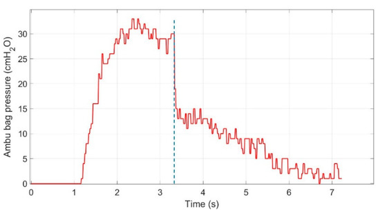Considering RPT ventilation mode, the aim of the developed control system is to control required pressure in patients’ lungs using AmbuBag, which is compressed by a pneumatic actuator. In other words, it is necessary to control air flow to a pneumatic actuator by which is AmbuBag compressed. The main problem is to obtain the required pressure of AmbuBag for the required time, since the character of AmbuBag is not very suitable for control purposes. By gradual compressing of AmbuBag, the output pressure also increases. However, after very subtle release of AmbuBag, the pressure decreases rapidly, see Figure 6. The compression of AmbuBag causes the gradually increasing pressure, up to roughly 30 cmH2O. However, by very little release of AmbuBag, the piston of the actuator was released roughly only 2 mm, and the pressure of AmbuBag decreased rapidly. The blue line in Figure 6 represents the moment when the piston of the actuator was released. The pressure decreased from 30 to only 13 cmH2O. Subsequently, the pressure was only decreasing without any motion of the pneumatic actuator.