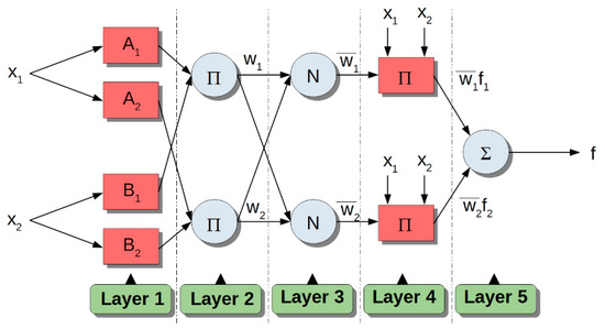 The control algorithm for the ventilator BreaThU is designed as an adaptive neuro-fuzzy controller. An adaptive neuro-fuzzy inference system (ANFIS) is a feed-forward neural network developed by Jang [22] which gives relations between input and output data to determine an optimal membership function. An artificial neural network and fuzzy logic model creates ANFIS architecture consisting of five different layers, see Figure 7. In this study, the architecture of ANFIS is based on the first-order Takagi–Sugeno model [23]. The individual layers of ANFIS have the following meaning.