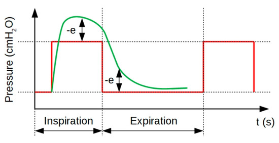 where is modifiable coefficient . When maximal value of pressure, , measured during one breathing cycle (in the inspiration phase), overshoots the reference pressure, , the coefficient, is manually changed to the lower value. On the other hand, when maximal measured pressure, during the breathing cycle is lower than the reference pressure, the coefficient, is manually changed to the higher value. This process is repeated until the reference pressure, equals to . Subsequently, the coefficient for the expiration phase is also modified in the same way. When the time course of the breathing cycle is approximately in accordance with the reference pressure, the measured data consisting of three input variables and one output variable are collected. With the presented algorithm, all input–output pairs necessary for the training process were collected.