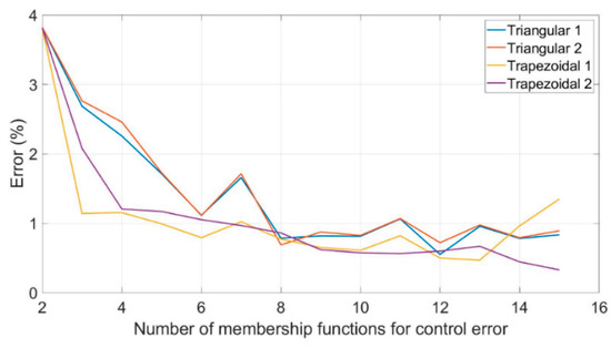 The comparison of individual results is shown in Figure 9. The meaning of individual legends from Figure 9 is as follows: Triangular 1—the same number of triangular membership functions for control error and speed error, Triangular 2—number of triangular membership functions for control error is twice the number of speed error triangular membership functions, Trapezoidal 1—the same number of trapezoidal membership functions for control error and speed error, Trapezoidal 2—the number of trapezoidal membership functions for control error is twice the number of speed error trapezoidal membership functions. In the case of an odd number of control error membership functions, the speed error is rounded up. As can be seen from Figure 9, trapezoidal membership function provides better results in comparison with triangular membership function. By comparison of Trapezoidal 1 and Trapezoidal 2, the results are not dramatically different. For this reason, the set of Trapezoidal 2 membership functions will be used, since they use a lower number of speed error membership functions. This solution is more suitable from the view of real-time application, while there will be a lower number of rules for the fuzzy controller.