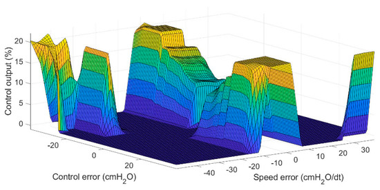 The cycle WHILE represents the main loop of the ventilation process. At first, all previous states of fuzzification are reset. The variable “order” serves for determination of the constant output value. In this case, there are 196 output values. The fuzzification means transforming a crisp quantity into a fuzzy quantity, which is based on Figure A1 and Equation (A1), see Appendix A. The rules of the trained fuzzy controller are processed by three nested cycles FOR and structure IF. Variables eMF, seMF and rpMF represent the results of fuzzification for control error, speed error and reference pressure, respectively.