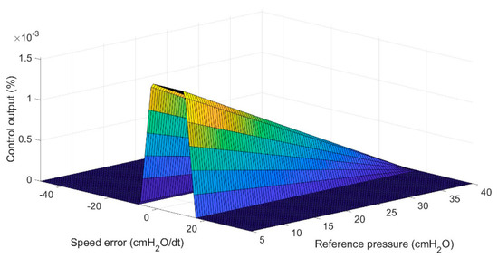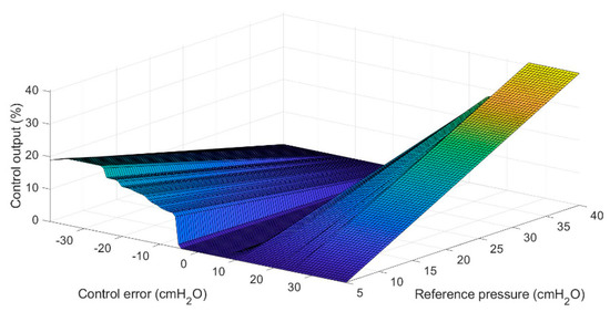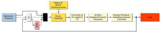 The coefficient of determination of Equation (15) is . The following Figure 21 shows the control scheme of the simulation. The reference pressure varies according to principles of inspiration and expiration phases described in previous sections of the paper. Using MATLAB 2019b ANFIS toolbox and training data, the fuzzy controller (FC) was determined. The result of the training process is the fuzzy controller with three inputs, namely control error, speed error and reference pressure. The output of the fuzzy controller is opening of air flow regulator with analog value with consideration of value −215 for a 0% opened regulator and value +215 for a 100% opened regulator. The output of the FC is subsequently converted to percentage value. The next block assumes Equation (14) describing the relation between percentage opening of the regulator and output pressure of the regulator. The last point of the control scheme is the model of AmbuBag with input force affecting AmbuBag and output pressure coming to the patient’s lung.