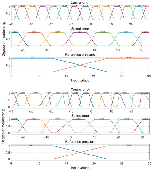 Based on the results offered in Table 1 and Table 2, an ANFIS structure with 14 membership functions for control error, 7 membership functions for speed error and 2 membership functions for reference pressure was chosen. The training process of the ANFIS structure 14–7–2 is shown in Figure 10. The output is set to be constant. In Figure 11, the process of training, testing and checking is shown. The influence of individual inputs to final output can be seen in Figure 12, Figure 13 and Figure 14. As can be seen, the main contribution to the control output is the control error and reference pressure. Figure 15 presents the membership functions of control error, speed error and reference pressure with structure 14–7–2. Figure 15 considers both the initial membership functions and membership functions after the training process for all input variables. The trapezoidal membership function is defined in Appendix A.