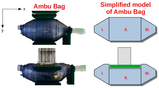 The presented Ambubag can be divided into three parts: parts I and III can be replaced by a truncated cone and part II can be replaced by a cylinder. As can be seen from Figure 16, the deformation of parts I and III seems to be not so obvious, compared to the deformation of part II. Next, by consideration of the small volume of air in parts I and III, in comparison with part II, the deformation of parts I and III is neglected during the compression of AmbuBag. For this reason, this analysis is based on the idea that during compression of AmbuBag, mainly the cylindrical part II is deformed.