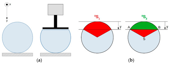 Let us consider part II of AmbuBag with perpendicular view in the x-axis direction, see Figure 17a. The pneumatic actuator compresses AmbuBag and it deforms its shape approximately, as it is shown in Figure 17a. To compute the volume of part II after deformation, let us consider Figure 17b. The deformed area is II (green color) and the final area after deformation can be expressed as: