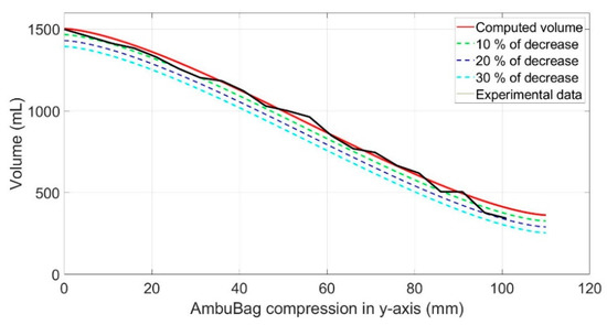 where is the length of part II of AmbuBag in the direction of the x-axis and . Equation (13) can be applied for the case when deformation of part II in the y-direction is lower than the value of radius, . On the other hand, Equation (13) assumes . An approximated mathematical description of air volume in AmbuBag was also experimentally verified. The results are shown in Figure 18. Except for mathematical expression of residual volume of AmbuBag (red color) and experimentally determined residual volume (black color), there are also curves, which express the residual volume of AmbuBag, with consideration of deformation of parts I and III. Figure 18 considers 10% (green color), 20% (purple color) and 30% (blue color) deformation of parts I and III of AmbuBag.