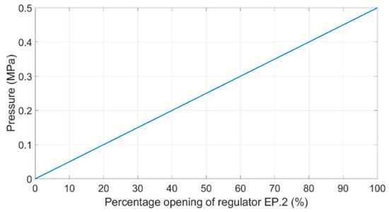 First of all, from the datasheet of EP.2 (ITV3050-03F4BN2-X15), the relation between percentage opening of regulator and its output pressure is expressed, see Figure 19. The relation is derived for our case assuming the maximum input pressure of 0.5 MPa. The relation between input percentage opening of the air flow regulator and its output pressure can be expressed by the following equation: