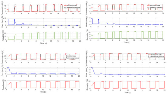 The simulation model works with fixed-step time of 0.001 s and simulation lasts 20 s. The simulations consider the reference pressure of 17, 22, 28 and 31 cmH2O. The PEEP value is set to be 5 cmH2O for all simulation cases. In Figure 22, the time course reference pressure and controlled pressure, control error and control output of regulator EP.2 are shown.