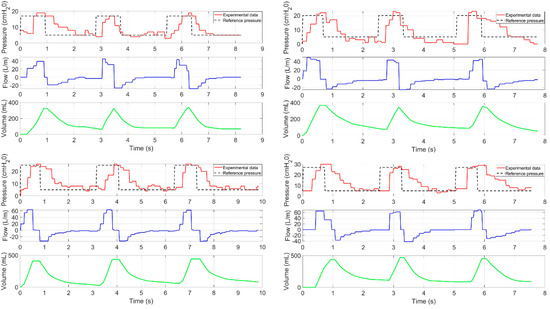 Experimental results from pressure control of mechanical ventilation. Top left: reference pressure 17 cmH2O. Top right: reference pressure 20 cmH2O. Bottom left: reference pressure 25 cmH2O. Bottom right: reference pressure 27 cmH2O.
