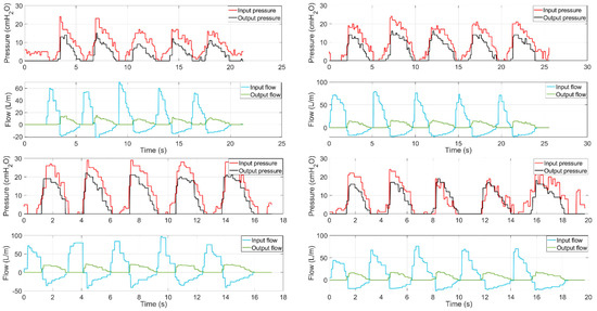 In Figure 24, the experimental results from assisted breathing mode are shown. In the figure, input and output measured values are shown. Input pressure and input air flow are measured before entering the patient’s mouth. On the other hand, output pressure and output air flow are measured in the second hose, which leads the exhaust to the surrounding environment. From the results presented in Figure 24, it can be seen that there is slightly lower output air flow in comparison with input air flow. The reasons for this are a not quite perfectly printed sensor interface by the 3D printer, and a not perfect seal of individual interface parts with sensors. However, these issues do not have any serious impact on the functionality of the mechanical ventilator.