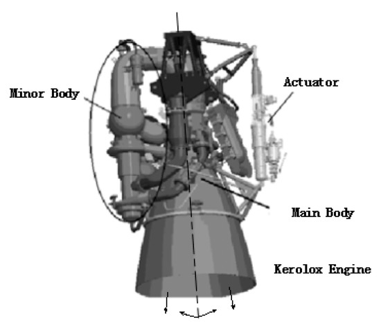 The assembly of an electro-hydraulic actuator and the driven 1200 kN kerolox engine is shown in Figure 1 [25,26]. The challenge is that the heavy turbo-pump assembly acts as a non-negligible minor mass connected to the main nozzle body so that two dominant resonance peaks emerge in the TVC loop and the traditional one-mass-one-spring model for the engine as the load of the actuator no longer applies. Additionally, as can be seen, there are some other smaller bodies outside of the main body, implying more minor resonance peaks in high frequency band.