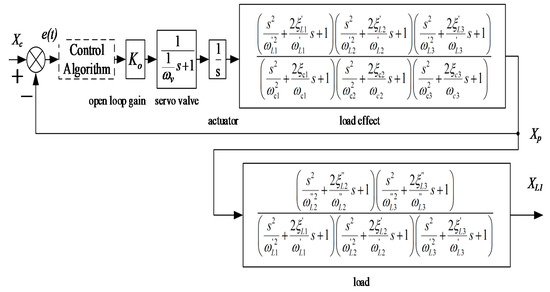 As can be seen in Figure 10, for the expected output XL1, it is only a half-closed loop. It needs to note that the half-closed loop is a classic aerospace design [2,28], where the actuator acts as an integrated control device for the simplest design and therefore the most reliable reasons in a higher system perspective, rather than another angular sensor needed in flight, though D.V. Lazić studied the approach [4]. Inside the piston position Xp loop, the fourth-order transfer function with two pairs of zeros and poles is dominant, both poorly damped, representing the effect of the outside fourth-order load dynamics on the closed position loop, called “load effect”, which is more complicated than that of an ordinary one-mass-one-spring modeled system [2,3,26].