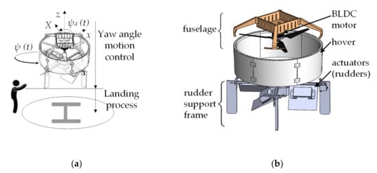 The yaw angle motion control of the designed DUAV model: (a) The yaw angle control process before the landing; (b) The structure of the DUAV model.