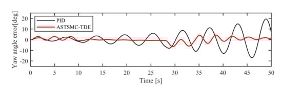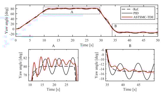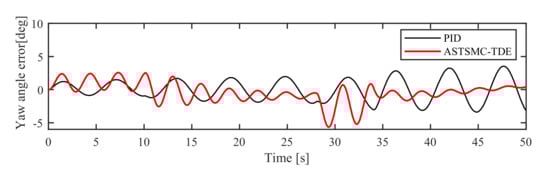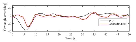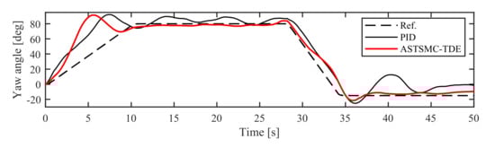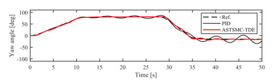 The ASTSMC-TDE scheme demonstrates good tracking performances and maintains system stability compared to the PID controller. The ASTSMC-TDE controller has not only the TDE part to cancel the nonlinear factors but also the ASMC term to suppress the resulting TDE errors. Therefore, the error values of the proposed control scheme are smaller than the PID control, as shown in Figure 26 and Figure 27. Figure 28 depicts the detailed control input signals from the ASTSMC-TDE and the PID controls that are evaluated with the ISV performance index.
