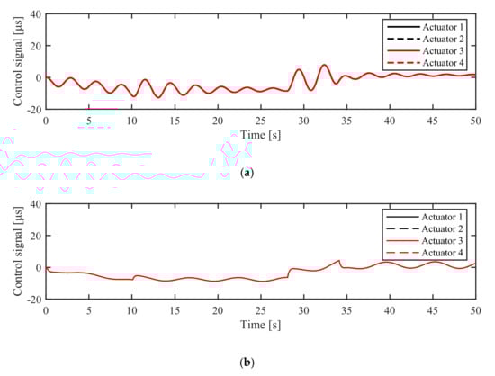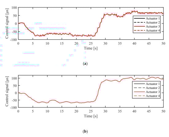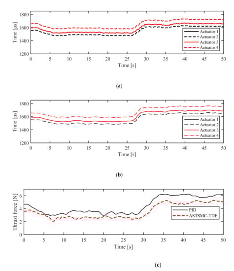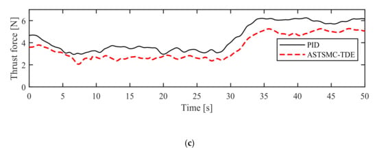 The switching gains of the ASMC term in Equation (16) are proved by Lemma 2 to be bounded by an upper bound, as shown in Figure 22a. The sliding manifold variables in Equation (4) are small and slowly varying, as illustrated in Figure 22b. The control inputs of ASTSMC-TDE and PID to each actuator are represented in Figure 23a,b, respectively. The thrust force generated by the BLDC motor is measured and shown in Figure 23c.