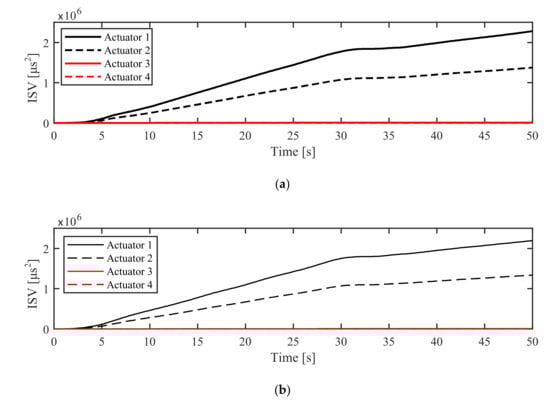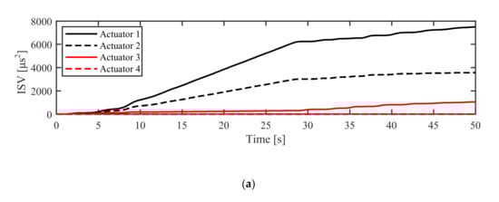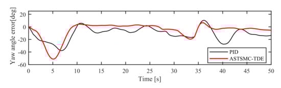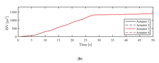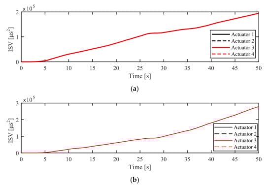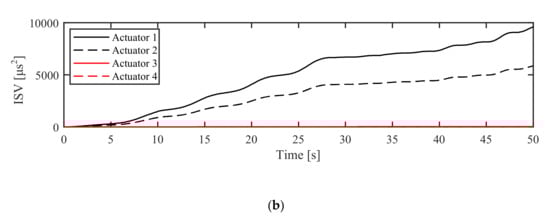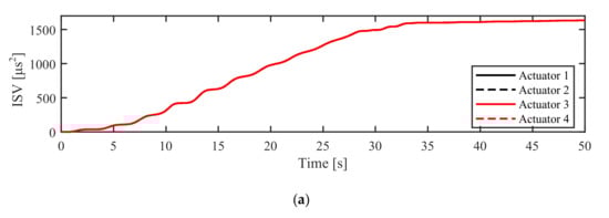 However, the RMSE method alone is unable to give a comprehensive evaluation of the control algorithms. Therefore, the integral of the time multiplied by the absolute value of the yaw angle error (ITAE), as well as the integral of the square value (ISV) of the actuator’s control input signal is additionally investigated [37]. The ITAE method in Equation (23) is used to measure the tracking error of the entire error curve. The ISV method in Equation (24) shows the energy consumption of the actuators. These performance indices are defined as follows: