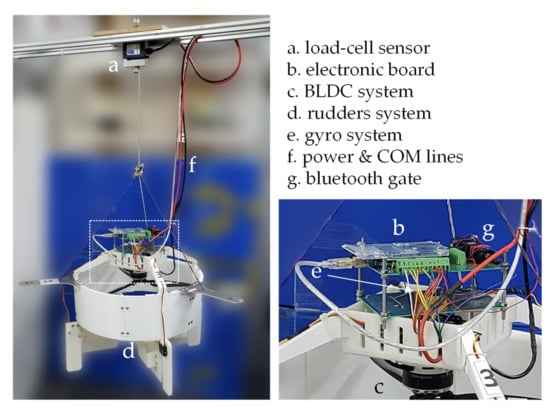 The DUAV system, illustrated in Figure 2b and Figure 3 consists of actuators (rudders), brushless DC motor system (BLDC motor and propellers), hover, and fuselage. The BLDC motor system has two main objectives. First, it generates the necessary thrust force to steer the yaw angle of the DUAV to the right position alongside the rudder system. Second, it counteracts gravitation during the landing. On the other hand, the rudder system is operated by four servomotors that are controlled by PWM signals. A load-cell sensor measures the thrust force of the BLDC motor. The yaw angle of the DUAV is fed back through a gyro sensor. The communication between the computer and the system, as well as with the sensors, is achieved via the RS-232 protocol. The experiment apparatus of the DUAV system is detailed in the experiment section.