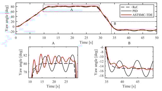 The control gains of the ASTSMC-TDE from Equation (13) are calculated as , , , and . The PID control gains are assigned as , , and .