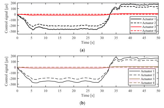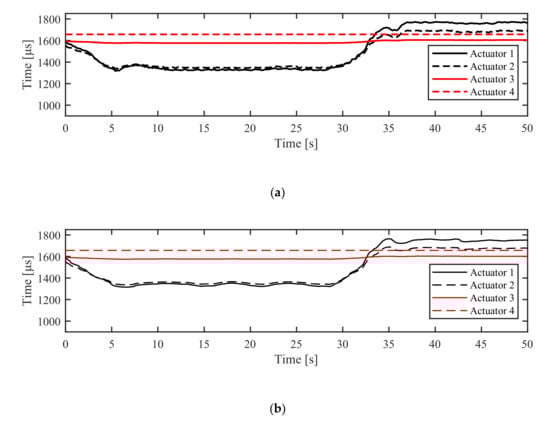 The identification and the tuning of the DUAV parameters were conducted using the system identification toolbox integrated with MATLAB. The parameters in Equation (3) are identified such that Lemma 1 is satisfied, thus The column vector of weights in Equations (4) and (13) is defined as . Besides, the actuators’ weighting matrices are defined as in NM and in AM configuration. In this study, especially, the positive symmetric matrix is chosen as a diagonal matrix given by , [42]. The initial values of the DUAV at are , , , , and . The sampling time is defined as and the low pass filter is selected as .