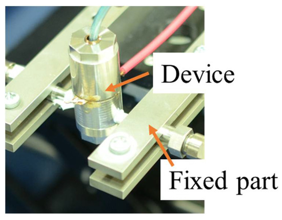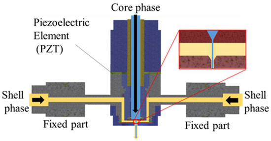 Figure 1 and Figure 2 show the schematic and photograph of the core–shell droplet generation device, respectively. The length of the device is 42.7 mm and the diameter is 18 mm. A bolt-clamped Langevin-type ultrasonic transducer was used to obtain flexural vibration. Piezoelectric elements (PZT) polarized in the thickness direction are sandwiched between metal blocks.