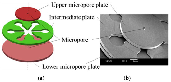 For alignment of the center of the upper and lower micropore plates, the micropores were placed at the center of each micropore plate. The flexural vibration is effective for oscillating the center of the micropore plate.