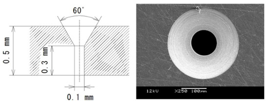 Schematic of upper micropore plate for core–shell droplet generation device: cross-sectional view of micropore (left) and SEM photograph of micropore (right).