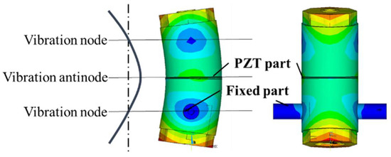 This device was designed using finite element method analysis, as shown in Figure 7. The device was subjected to a first-order flexural vibration mode. The fixed part and the vibration node are at the same position; this design prevents vibration damping.