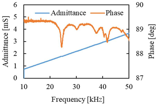 The relationship between frequency, admittance, and phase is shown in Figure 8. This device was designed to provide first-order flexural vibration at 30 kHz. The resonance frequency of the fabricated device was observed using a laser Doppler vibrometer at a frequency of 29 kHz.