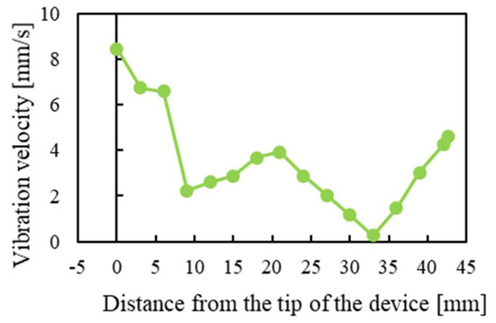 Relationship between the distance from the tip of the core–shell droplet generation device and the vibration velocity, when the driving frequency was 29 kHz.