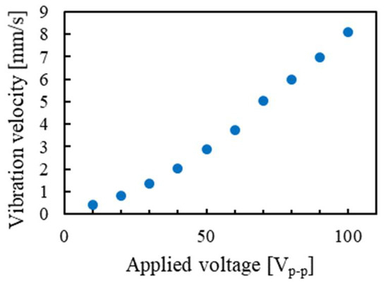 Relationship between the applied voltage and the vibration velocity, when the driving frequency was 29 kHz.