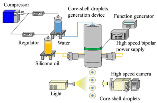 A microfluidic device composed of glass capillaries is a typical device used for generating core–shell drop-lets [7,8,9,10,11]. The droplets are generated individually in the microchannel, achieving a production rate of thousands of droplets per second.