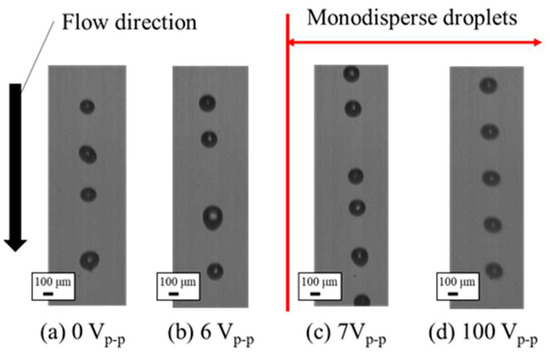 As shown in the experimental results, monodisperse core–shell droplets were generated by adjusting the applied voltage and the applied pressure. The voltage has a threshold value at which core–shell droplets can be generated. Because the applied voltage is almost proportional to the vibration velocity, the droplet generation requires a vibration velocity higher than the specified value.