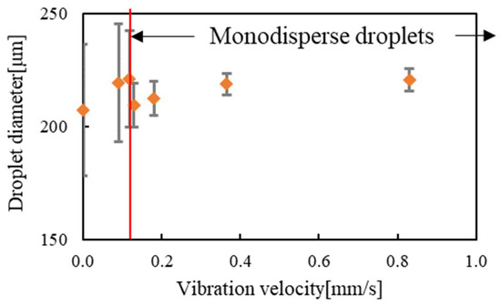 Figure 12 shows photographs of the generated core–shell droplets in the air when the applied voltages were 0, 6, 7, and 100 Vp-p. The vibration velocities of the micropore were 0, 0.12, 0.13, and 8.2 mm/s. Figure 13 shows the relationship between vibration velocity and the diameter of droplet. Table 1 shows the average droplet diameter when the applied voltage was changed. Figure 13 and Table 1 shows that monodisperse droplets were generated when the applied voltage was larger than 7 Vp-p.