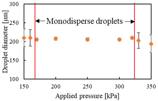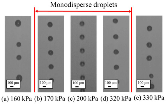 Figure 14 shows photographs of the generated core–shell droplets in air when the applied pressure for the core phase was changed. Figure 15 shows the relationship between vibration velocity and droplet diameter. Table 2 shows average droplet diameter when the applied pressure for the core phase was changed. According to Table 2 monodisperse droplets were generated when the applied pressure was between 170 kPa and 320 kPa.