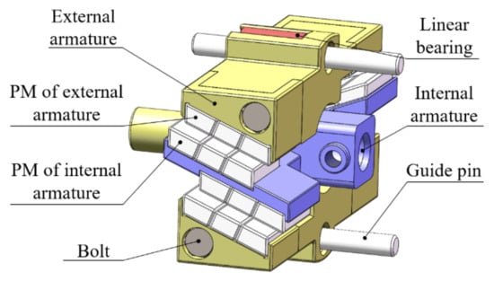 Figure 1 illustrates the configuration of maglev coupling, which mainly includes external armature, internal armature, permanent magnets (PMs), linear bearing, and guide pin. The pole surfaces of the external armature and internal armature are deliberately designed to be inclined with pitch angle , where these angles are all the same and arranged by a 180° array. One end of the guide pin is fixed with the valve body cover, and the other end is inserted into the linear bearing, thus the external armature is guided to move linearly only, while the internal armature can move both linearly and rotationally. The pole surfaces of the external armature and internal armature are all inserted with several PMs. In order to increase magnetic intensity in the air gap, an opposed Halbach array is adopted for the arrangement of these PMs. Figure 2 illustrates the detailed configuration and magnetization directions where at least three different PMs are used to constitute each part of Halbach array. Note that more PMs are also feasible, however, it would increase assembly difficulties. The magnetic forces generated by upper section and the lower section of Halbach array should be mutually repulsive so that the internal armature can be levitated in the middle of the external armature in a non-contact way.