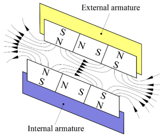 - Yonnet, J.P. Permanent magnet bearings and couplings. IEEE Trans. Magn. 1981, 17, 1169–1173. [Google Scholar] [CrossRef]