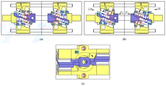 Figure 4a,b illustrate the detailed force analysis for maglev coupling. The magnetic repulsive forces generated by the Halbach array, i.e., , , , can be further resolved into axial components , , , and tangential components , , , . When LEMC is not electrified, the magnetic repulsive forces are equal, as shown in Figure 4a, and the hp-hole has the same overlapping height with respect to the sensing groove as does the lp-hole. Therefore, the pressure of the control chamber regulated together by the hp-hole and lp-hole is , and the pressure area of the left high-pressure chamber is half of the right control chamber. Thus, the assembly of the internal armature-spool is under a state of static balance. When LEMC is electrified, the external armature moves , and the , , , decreases and the , , , increases, as shown in Figure 4b. Among them, the resulting force of axial components would be compensated by the Bernoulli force , and the resultant force of tangential components would generate a torque to drive the spool to rotate clockwise, as shown in Figure 4c, and this rotary motion changes two overlapping openings differentially, which varies the control chamber pressure and causes the imbalance of hydrostatic force acting on the spool, therefore the spool moves towards the right. This linear motion of the spool again results in the changes of magnetic repulsive forces, which leads to the reverse rotation of the spool until these forces return to their initial value, and the overlapping openings of hp-hole and lp-hole with sensing groove equals again. As a result, the force balance is re-established and the spool is in a new equilibrium position.