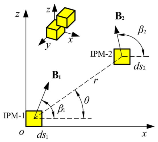 Figure 5 demonstrate two infinitesimals of permanent magnet (denoted as IPM) with unit length in the y axis direction, where , are the area of IPM-1 and IPM-2, respectively; , are the residual magnetic induction intensity of IPM-1 and IPM-2, respectively; , is the angle between , and the positive direction of x axis; is the distance between IPM-1 and IPM-2 in the xoz plane; is the angle between and the positive direction of the x axis. According to the theory of point magnetic charge, if IPM-2 is placed in the magnetic field generated by IPM-1, the interaction force will be generated and the magnetic common energy can be expressed as [31,32]