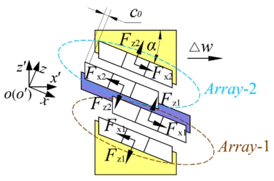 Since the magnetic force between the permanent magnets follows the principle of superposition, based on the analytical model of Equations (8)–(13), the total magnetic forces of the opposed Halbach array of maglev coupling can be calculated. Figure 9 illustrates the two opposed Halbach arrays located on same side of maglev coupling, which are denoted as array-1 and array-2, respectively. Since the structure is axisymmetric, only array-1 is used for the following analysis. Figure 10 shows the schematic diagram of decomposing of array-1, where the PMs of the upper part and lower part are decomposed into PMUs of , , , , and , , , , , respectively, and any interaction force of these different PMUs can be calculated by one of Equations (8)–(13). In Figure 10, is the initial shifted distance on x–axis direction between the upper part and lower part; is the initial air gap height of coupling in the z axis direction; is the moving displacement of external armature in the axis direction; is the pitch angle of coupling. The coordinate system is oriented for the arrangement of the Halbach array and the is oriented for the displacement of the external armature and valve spool.