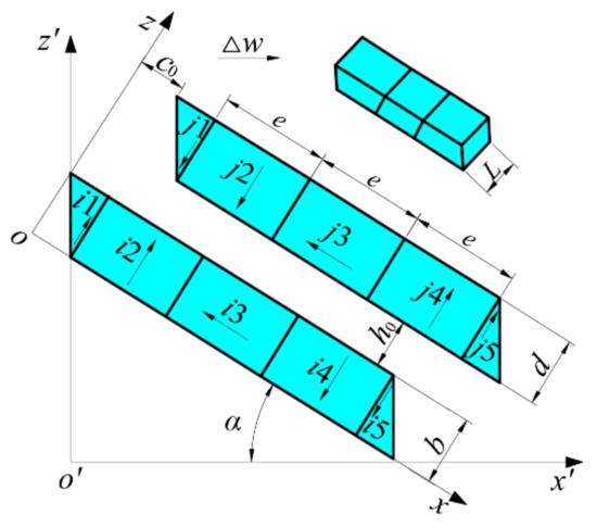 where and are the magnetic force of the triangular–triangular CPMUs in the x and z directions, respectively. and are the intermediate expressions introduced in order to shorten Equations (10) and (11) after multiple integrals. , , and are the intermediate parameters introduced to distinguish the different integration area and triangular–rectangular CPMUs, whose values are listed in Table 2. is the distance between the left vertex of the hypotenuse and the vertical edge of the green color triangle; is the distance between the lower vertex of the hypotenuse and the horizontal edge of the green color triangle; is the distance between the lower vertex of green color triangle hypotenuse and z axis; is the slope of green color triangle hypotenuse.