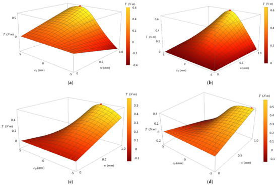 Surface curve of the output torque: (a) = 20°; (b) = 40°; (c) = 60°; and (d) = 80°.