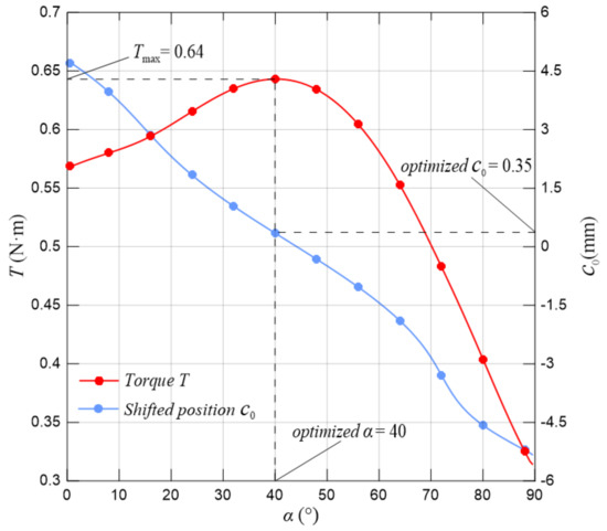 The pitch angle and the shifted distance have a significant influence on the performance of the maglev coupling. In order to further verify the analytical modelling results in Section 3, the torque–displacement characteristics are simulated where = 30°, = 40°, = 50° and corresponding optimal and − 2, + 2, − 4, + 4 are selected.